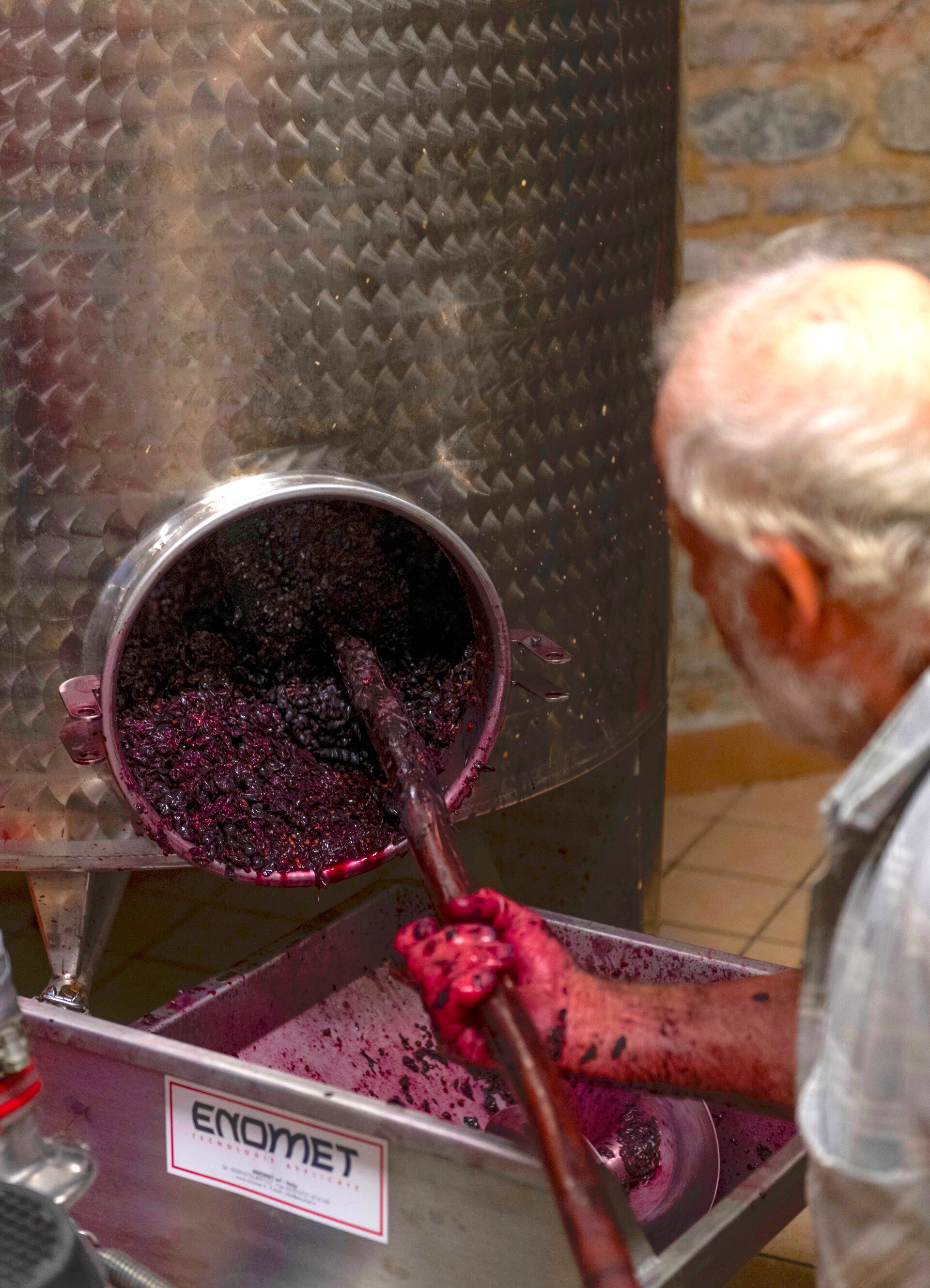 Le uve raccolte e selezionate vengono pigiadiraspate e avviate a fermentazione naturale senza aggiunta di alcuna sostanza. Nel caso del rosato e di alcuni bianchi, alla pigiadiraspatura segue una pressatura soffice per separare subito il mosto dalle vinacce. I rossi fermentano in buccia per un periodo variabile (6 -10 giorni) in fusti di acciaio della capacità di 10-16 q. Il mosto e le vinacce vengono rimescolati ogni 8 ore per evitare ossidazioni e favorire l’uniformità della fermentazione che avviene esclusivamente grazie ai lieviti autoctoni. La scelta sui tempi di raccolta e fermentazione viene effettuata assaggiando uve e mosti senza l’ausilio di strumenti. Solo prima della commercializzazione si eseguono le analisi di laboratorio necessarie per legge. Dopo la pressatura i mosti vengono lasciati fermentare per 15-20 giorni e quindi travasati per separarli dalle fecce grossolane. Il secondo travaso avviene circa 2 mesi dopo e in alcuni casi (bianchi e rosati) si effettua una solfitazione a basso dosaggio. I rossi vengono solfitati in occasione dell’ultimo travaso. La dose di metabisolfito di potassio viene tenuta il più bassa possibile e varia dai 35 ai 60 mg/L a fronte di un limite di legge (per il biologico) di 100 mg per i rossi e 150 mg per i bianchi e rosati. I vini giovani vengono venduti sfusi. Una selezione, dopo l’affinamento in acciaio, viene imbottigliata ed etichettata a mano e lasciata ad affinare in bottiglia per un periodo variabile.